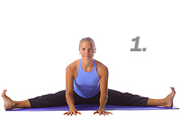 Begin by sitting on the floor with the legs extended in front. If you are a beginner, place the lower back, spine and head against a wall. Now extend the legs out to the side lifting the toes up towards the sky and gently press the backs of the knees into the floor. If you are more flexibly, you don't need to be against a wall in this position. Gently press the sitting bones into the floor, lengthen the spine and lift the crown towards the sky. Inhale and lengthen exhale and slowly move forward from the waist maintaining an erect spine. For beginners, one may not even have to lean forward to feel the stretch. For intermediate, one can drop down to the elbows and for advanced, grab onto the big toes with the first two fingers and slowly work the chest down towards the floor. Resist the temptation of rounding the spine just to get the chest or head to the floor. Keep the quadriceps engaged by lifting the kneecaps and the backs of the knees pressing into the floor. Hold this posture for 5 to 10 deep breaths.